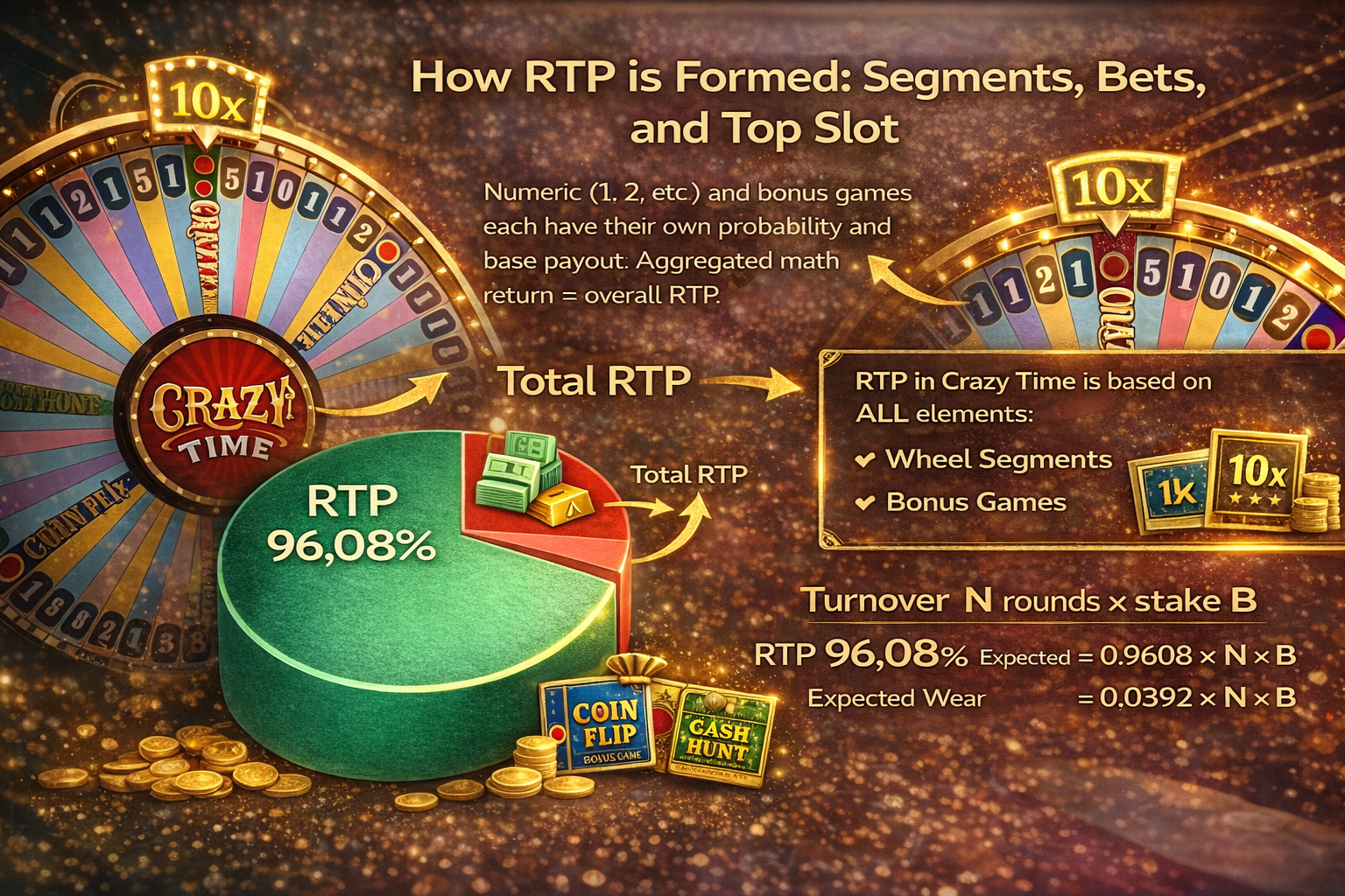 In Crazy Time, RTP is computed across all elements: the wheel with numbered segments, bonus games, and the Top Slot effect that can multiply payouts on specific bets. The exact configuration of segments, multipliers, and rules can differ, so exact values may vary depending on the game version and operator. RTP describes the average return, while the win distribution remains clumpy, which is why short sessions can be much better or worse than the average.
