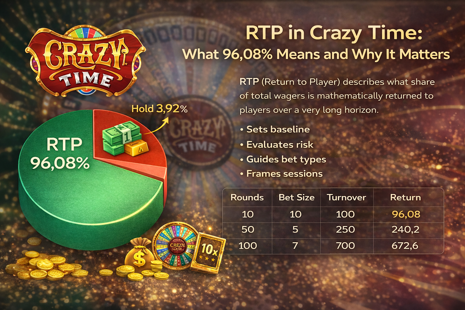 Below we explain how RTP works in Crazy Time, why short-term results wander around theory, how different bet options feel, which myths to drop, and what is actually under player control.
