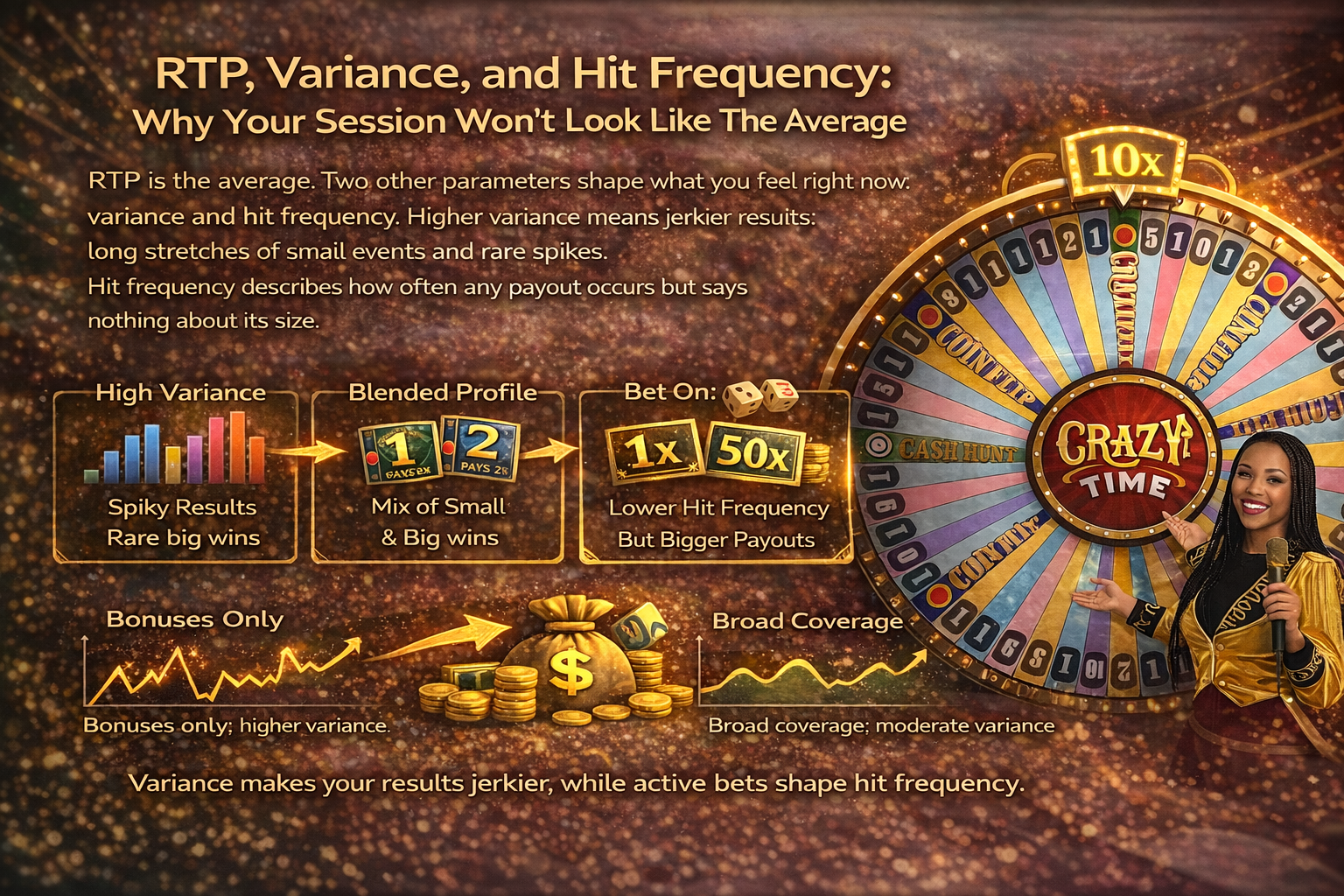 RTP is the average. Two other parameters shape what you feel right now: variance and hit frequency. Higher variance means jerkier results: long stretches of small events and rare spikes. Hit frequency describes how often any payout occurs but says nothing about its size.